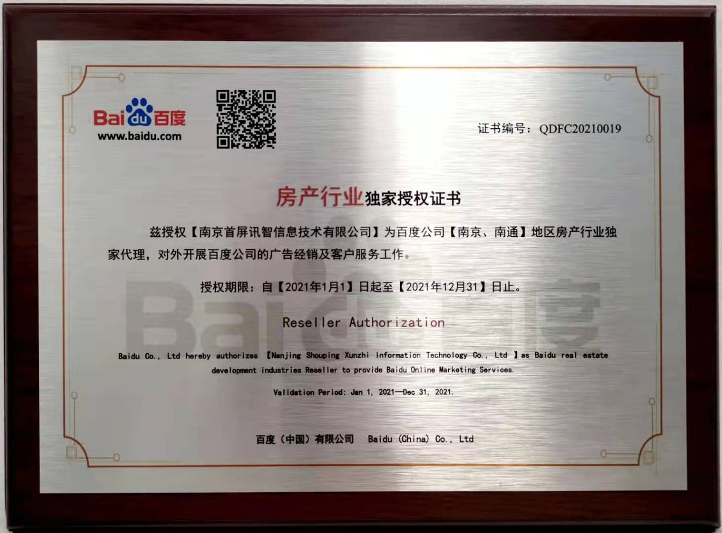 會上,百度公司正式授權南京首屏訊智信息技術有限公司為南京、南通地區(qū)房產行業(yè)獨家代理商及百度房產平臺南京、南通地區(qū)獨家運營商,并頒發(fā)授權證書。首屏訊智自2004年成為百度合作伙伴,始終致力于為廣大企業(yè)提供優(yōu)質的互聯(lián)網營銷服務。擁有17年豐富互聯(lián)網行業(yè)服務經驗的首屏訊智,已服務南京企業(yè)2萬余家,助力廣大企業(yè)快速穩(wěn)健發(fā)展。